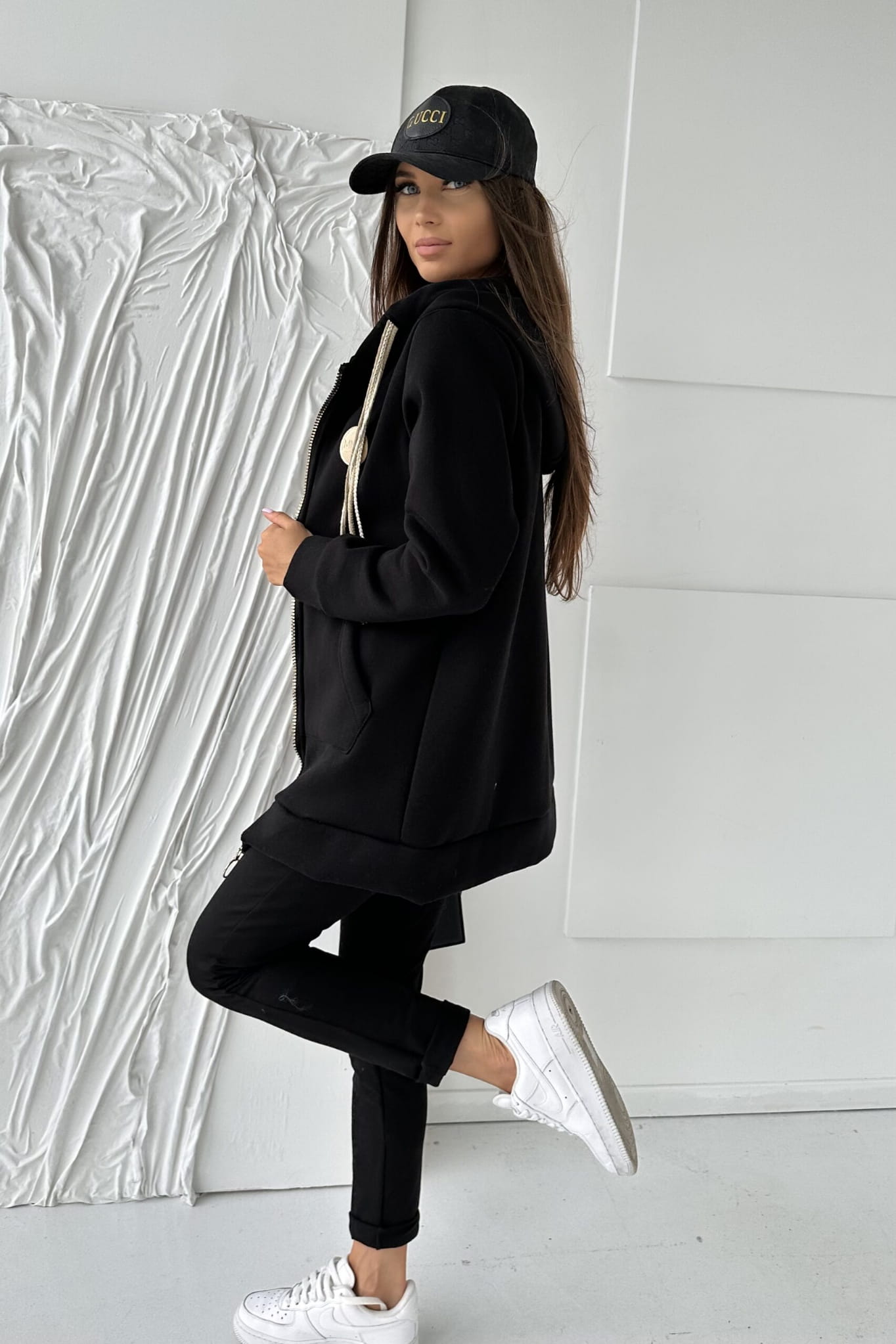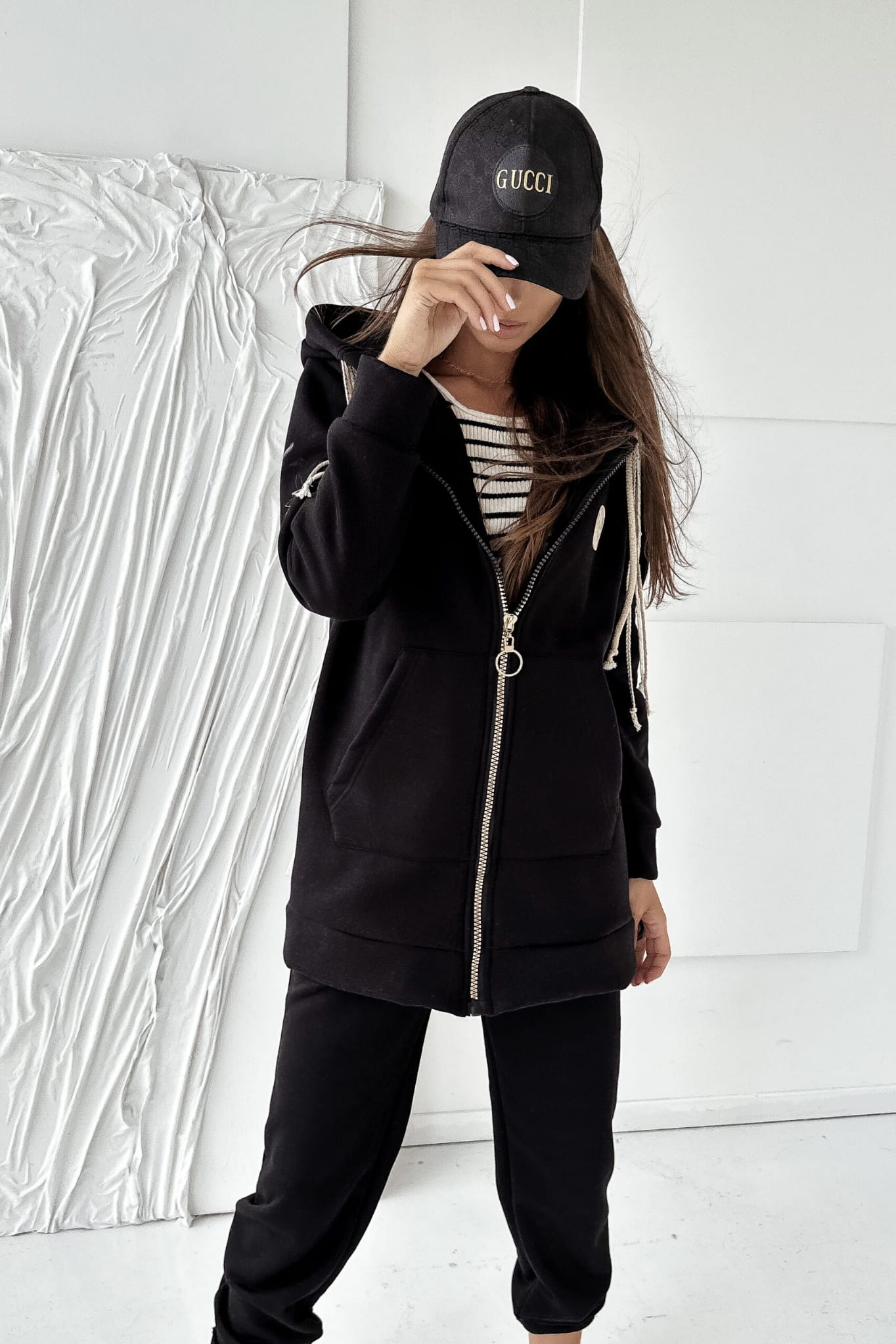 Przepiękna bawełniana dłuższa bluza ocieplana z kapturem, który jako troczki ma 4 ozdobne sznurki w stylu boho. Zapinana na złoty metalowy zamek posiada 2 kieszenie.