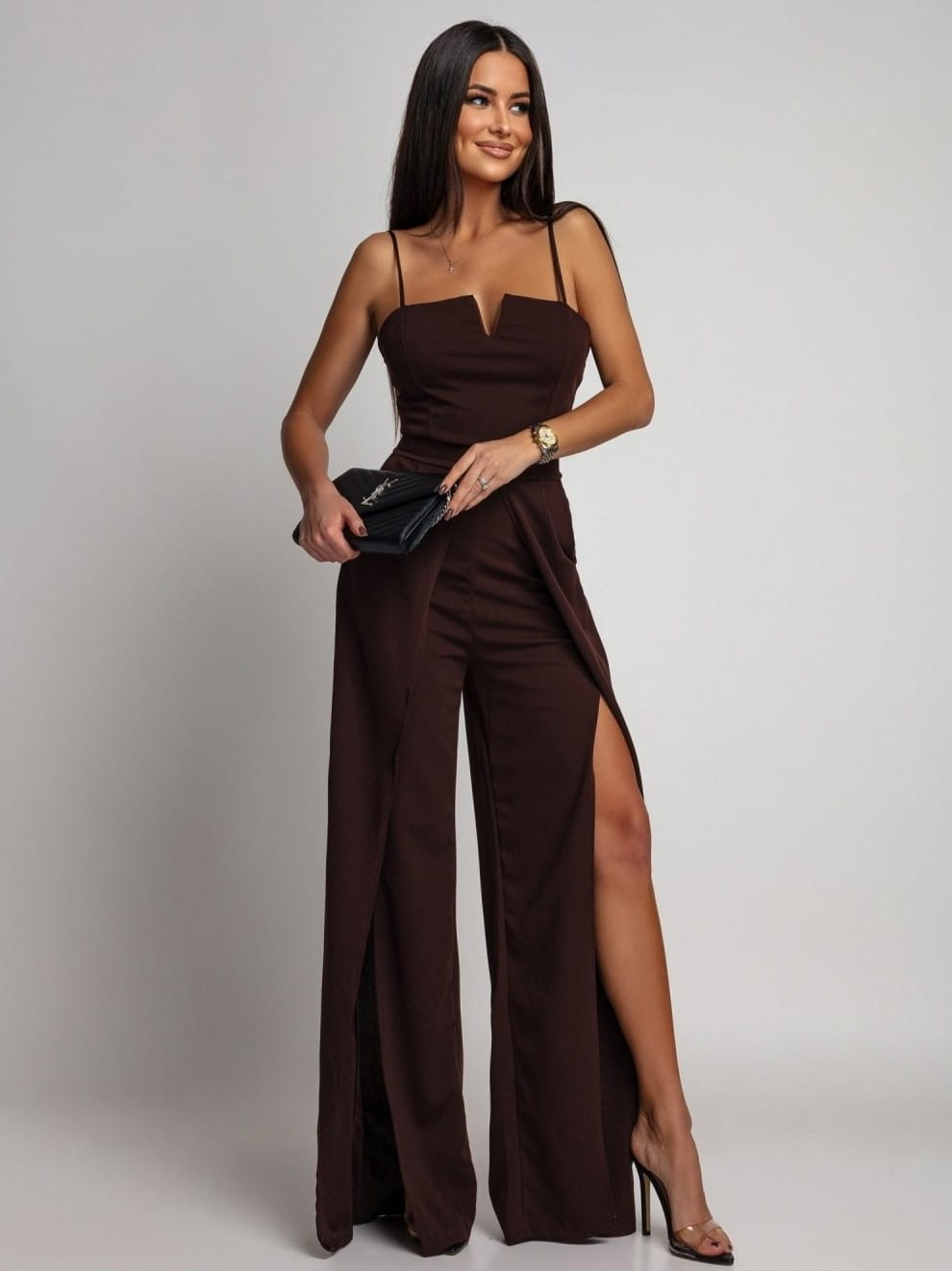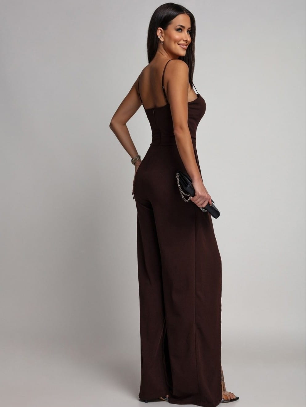 Ten wyjątkowy kombinezon maxi to połączenie kobiecego wdzięku i codziennego komfortu. Cienkie, regulowane ramiączka subtelnie eksponują ramiona, a delikatne rozcięcie przy dekolcie dodaje całości lekkości i finezji. Dopracowany krój sprawia, że sylwetka prezentuje się niezwykle korzystnie. Szerokie, rozcięte nogawki pięknie układają się w ruchu, podkreślając atuty każdej figury. Z tyłu dyskretny zamek ułatwia zakładanie i gwarantuje idealne dopasowanie.