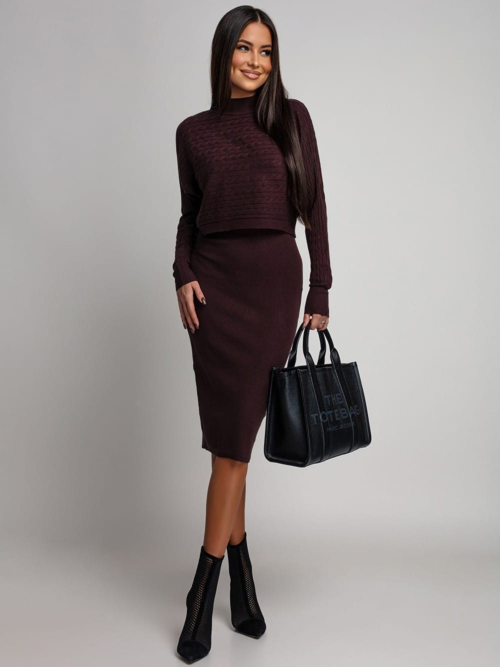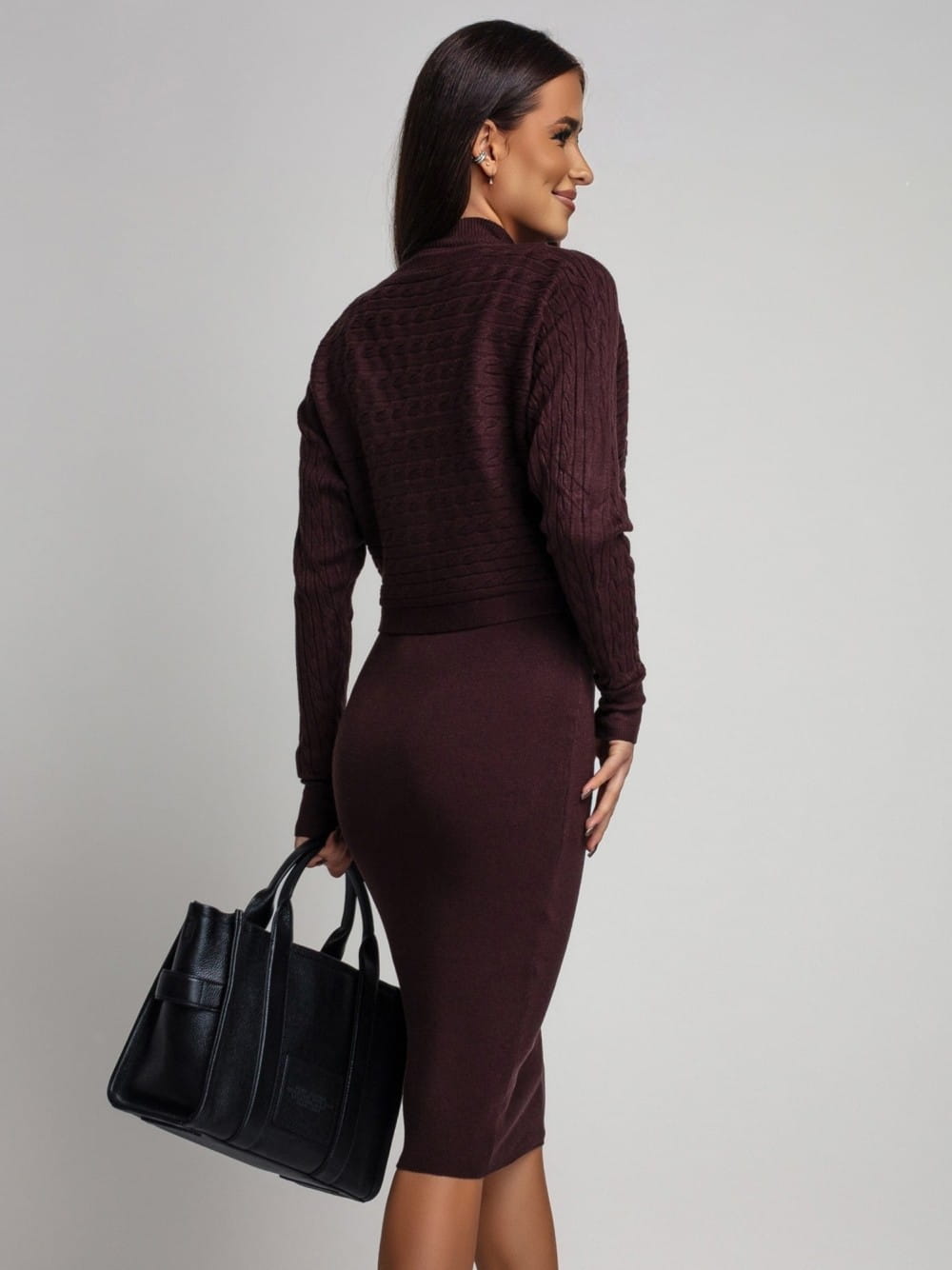 Stylowy komplet w odcieniu brązu, składający się ze swetra i sukienki.