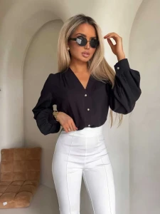 Koszula o klasycznym kroju z dekoltem w serek, zapinana na ozdobne guziki, które dodają jej szyku i elegancji.