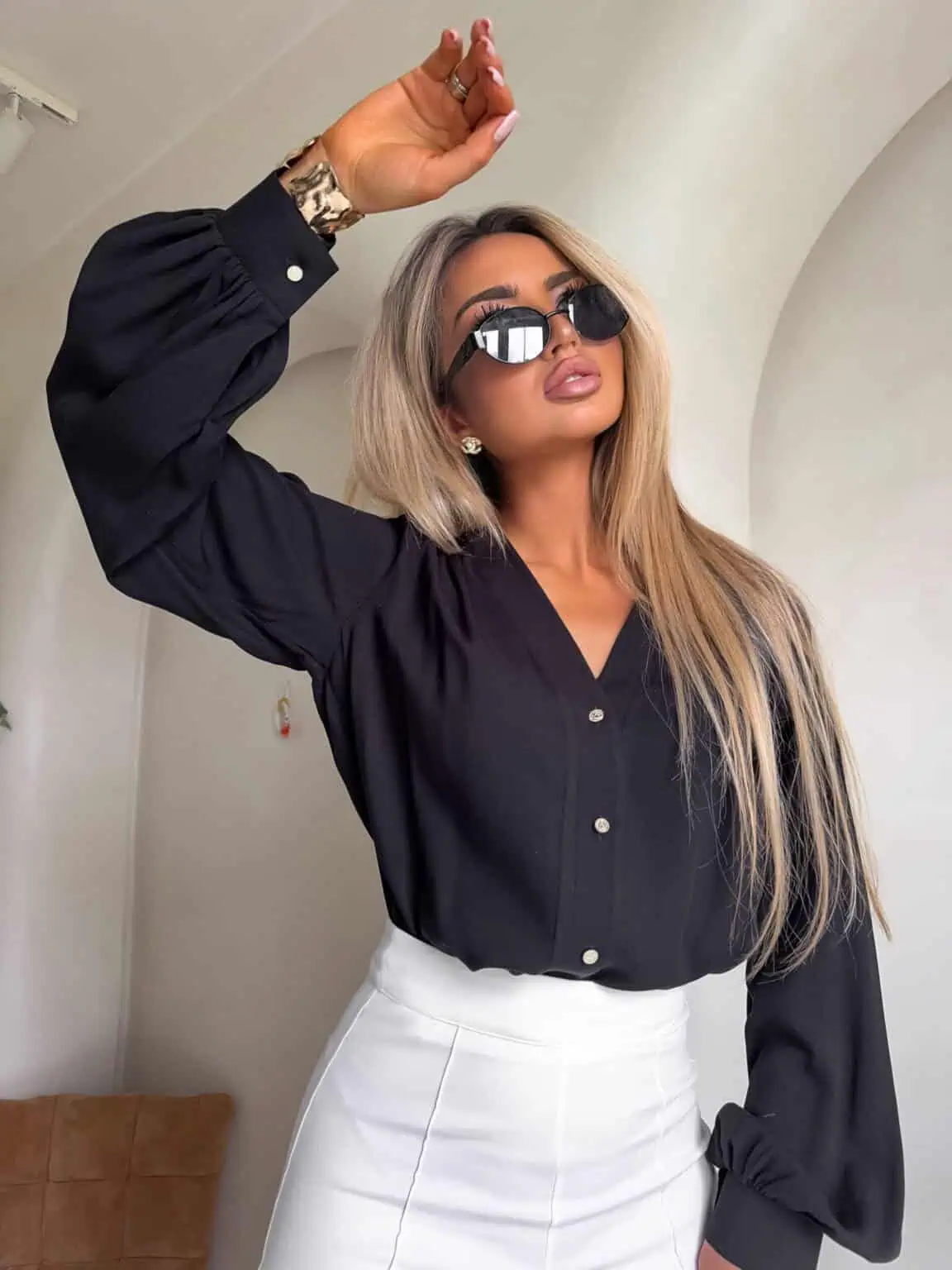 Luźne rękawy gwarantują swobodę ruchów, a mankiety zapinane na guziki subtelnie dopełniają całość.