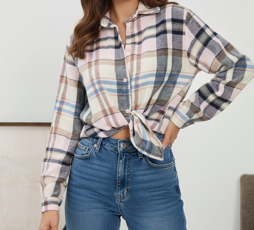 Charakterystyczny splot kraty w pastelowej odsłonie dodaje stylizacji świeżości, a luźny fason sprawia, że koszula świetnie prezentuje się na każdej sylwetce. Noś ją tak, jak lubisz: rozpiętą na gładki top, przewiązaną w talii lub klasycznie wpuszczoną w jeansy. To baza, która daje dziesiątki możliwości.