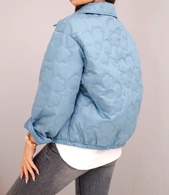 Lekka, pikowana kurtka o krótszym fasonie, delikatnie ocieplana syntetycznym wypełnieniem. Model z kołnierzykiem, zapinany na ozdobne złote guziki. Posiada praktyczne kieszenie oraz elastyczną gumkę w dolnej części, która zapewnia wygodne dopasowanie. Idealna na sezon przejściowy.