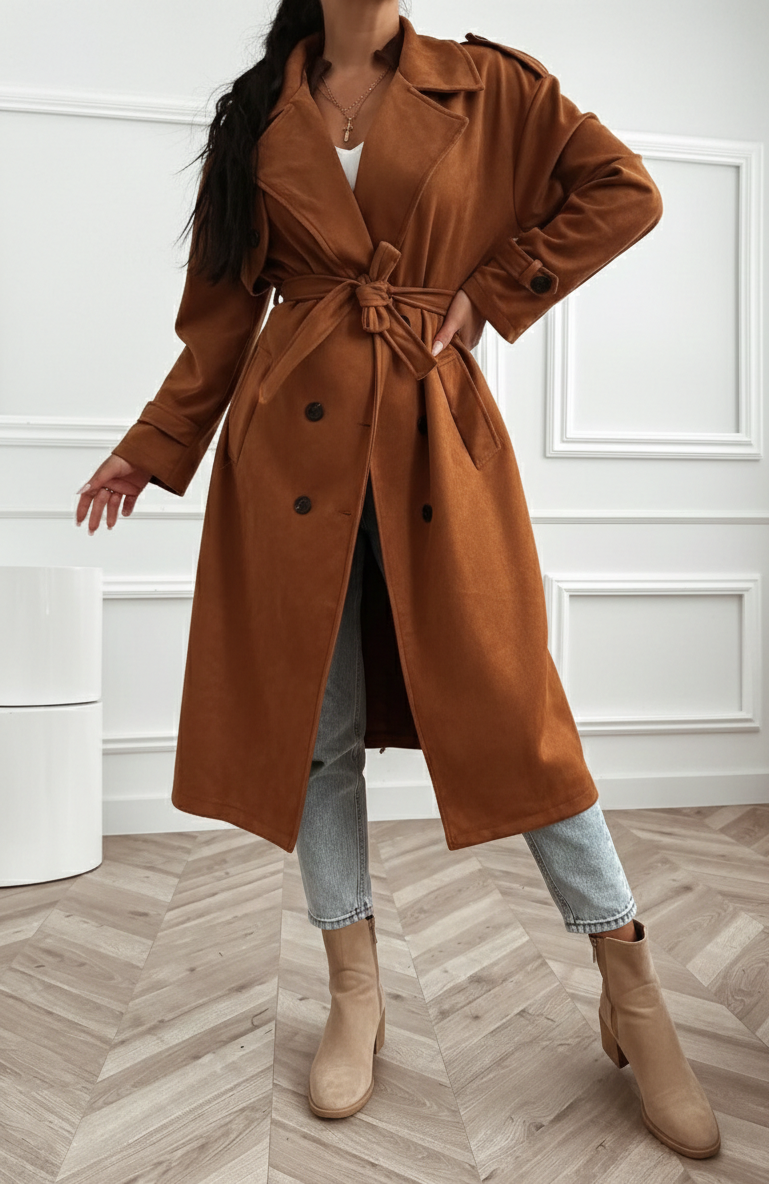 Elegancki płaszcz o wydłużonym fasonie wykonany z miękkiego materiału imitującego zamsz. Klasyczny kołnierz, zapięcie na guziki oraz pagony na ramionach nadają mu ponadczasowego charakteru. Dołączony pasek pozwala dopasować krój do sylwetki, podkreślając talię. Model został wyposażony w praktyczne kieszenie z przodu, które dodają mu funkcjonalności i stylowego wykończenia.