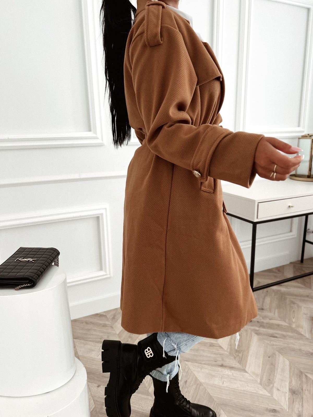 Płaszcz z paskiem w talii dwurzędowym zapięciem i kieszeniami. Wykonany z prążkowanej tkaniny posiada podszewkę oraz ozdobne pagony z guzikami na ramionach. Klasyczny fason, który sprawdzi się zarówno na co dzień, jak i w eleganckich stylizacjach.