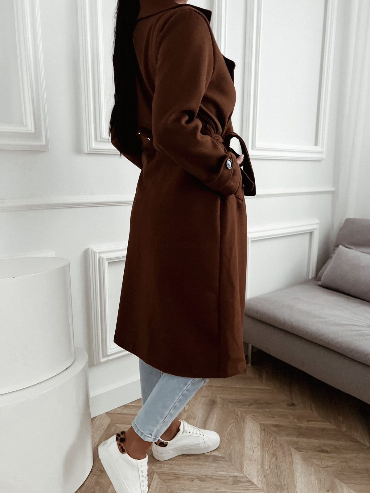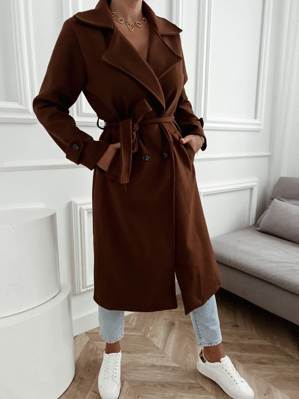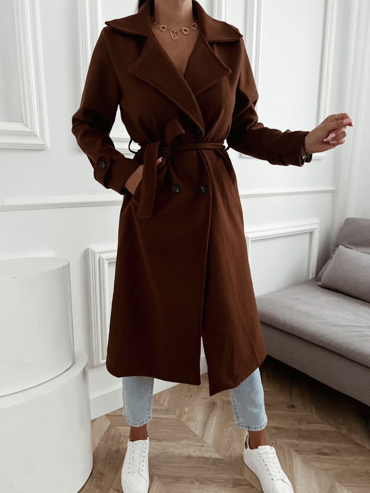 Płaszcz dwurzędowy Minimal brązowy z paskiem