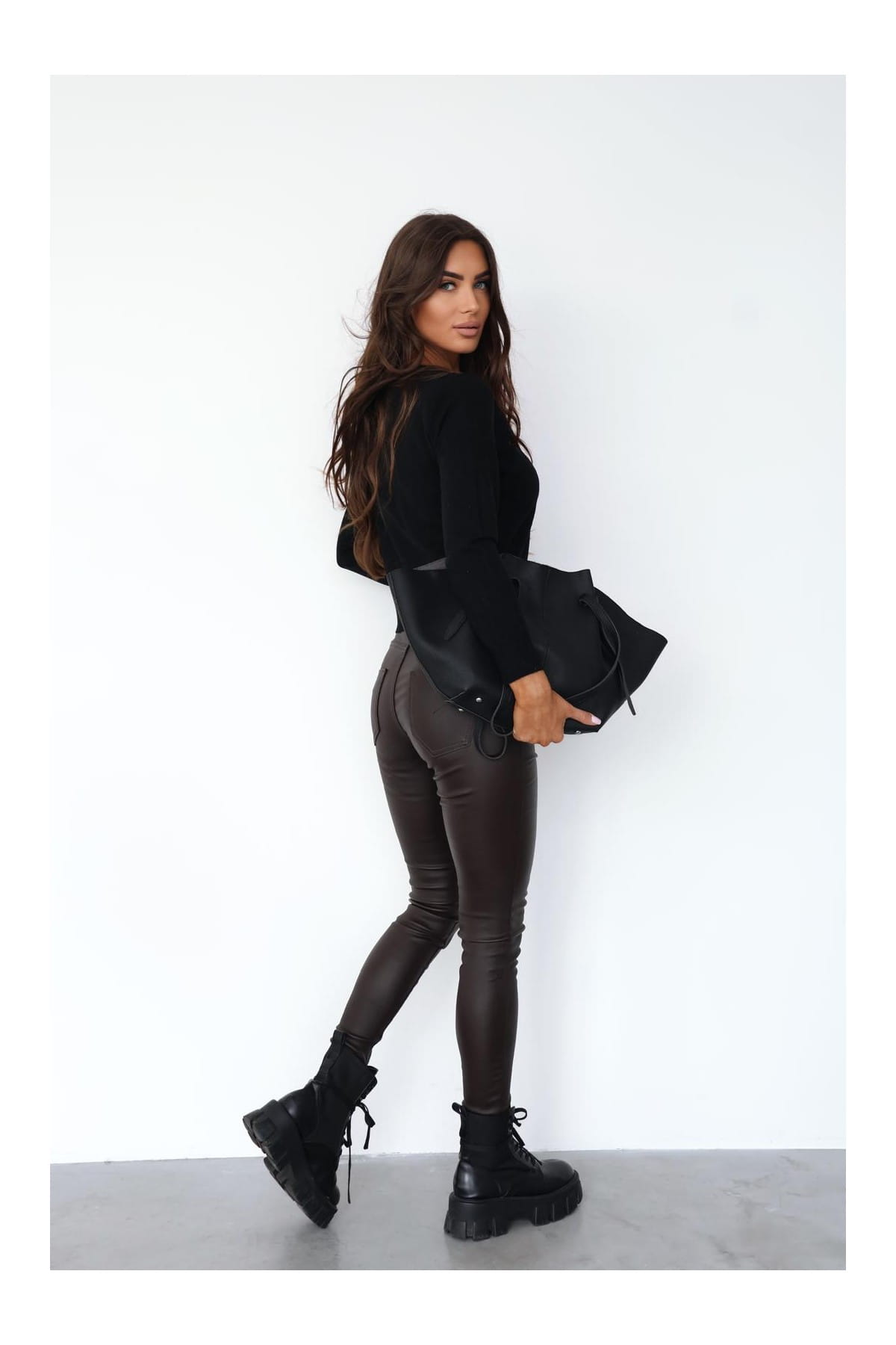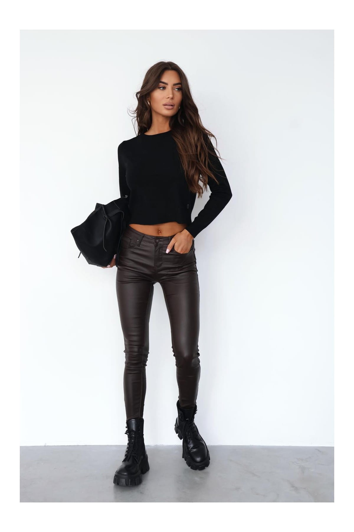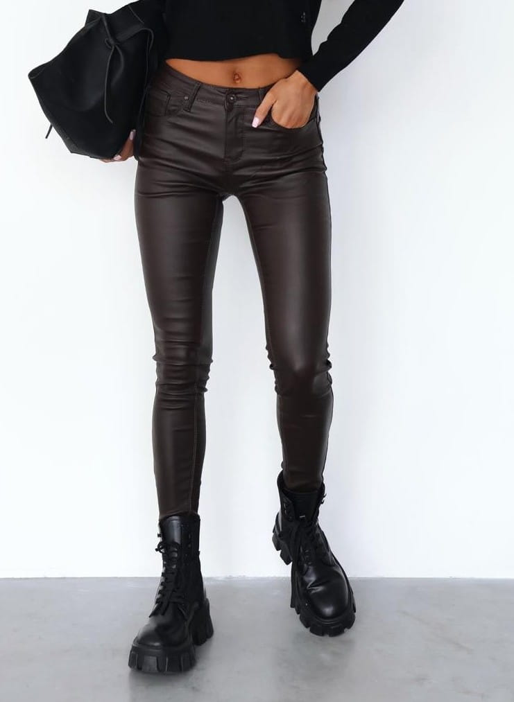 Spodnie o kroju skinny wykonane z woskowanego materiału. Model zapinany jest na suwak oraz guzik, posiada kieszenie z przodu i z tyłu oraz szlufki.