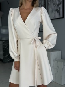 Elegancka sukienka dzwonek przed kolano, która zachwyca elegancją i subtelnym wdziękiem. Model z przekładanym dekoltem dodaje kobiecego uroku. Długie rękawy z ozdobnymi mankietami zakończone złotym guziczkiem. Wiązanie w talii pozwala na idealne dopasowanie i podkreślenie sylwetki. Znakomity model na wszelkie uroczystości, imprezy, wieczorne wyjścia oraz spotkania w pracy.