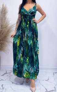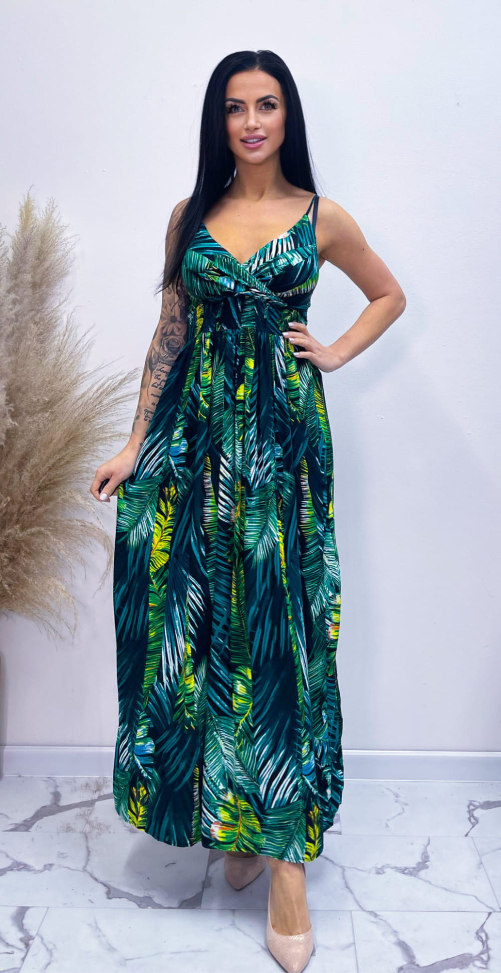 Model na cienkich ramiączkach z kopertowym dekoltem pięknie podkreśla biust, a wszyta w pasie gumka subtelnie akcentuje talię, gwarantując jednocześnie komfort noszenia.